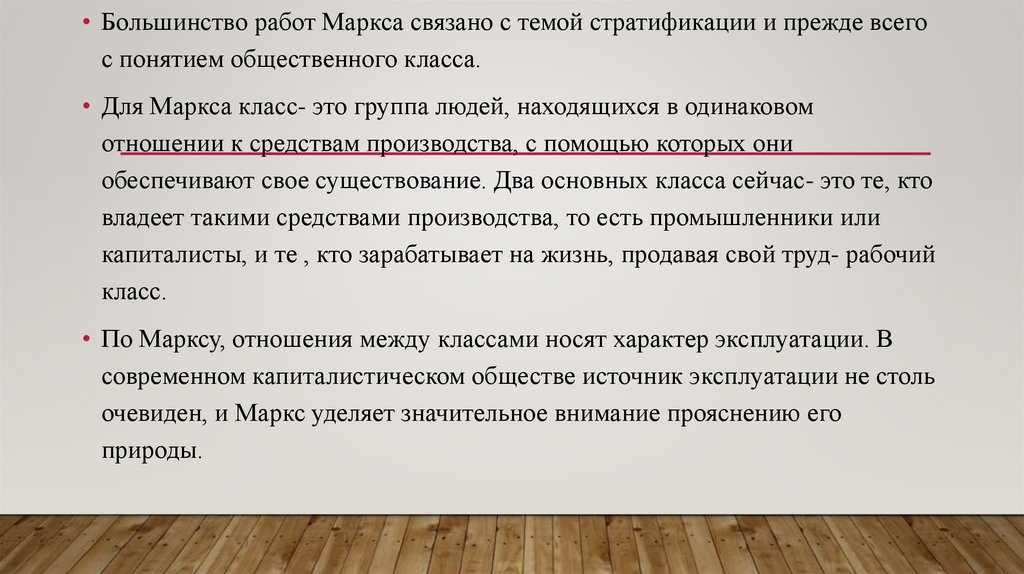 • Большинство работ Маркса связано с темой стратификации и прежде всегос понятием общественного класса.
