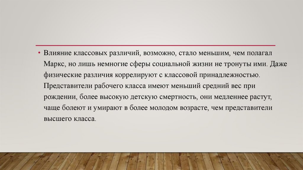 • Влияние классовых различий, возможно, стало меньшим, чем полагалМаркс, но лишь немногие сферы социальной жизни не тронуты ими. Даже