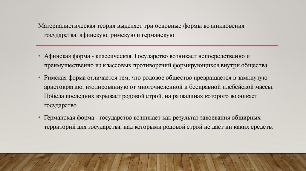 Материалистическая теория выделяет три основные формы возникновениягосударства: афинскую, римскую и германскую