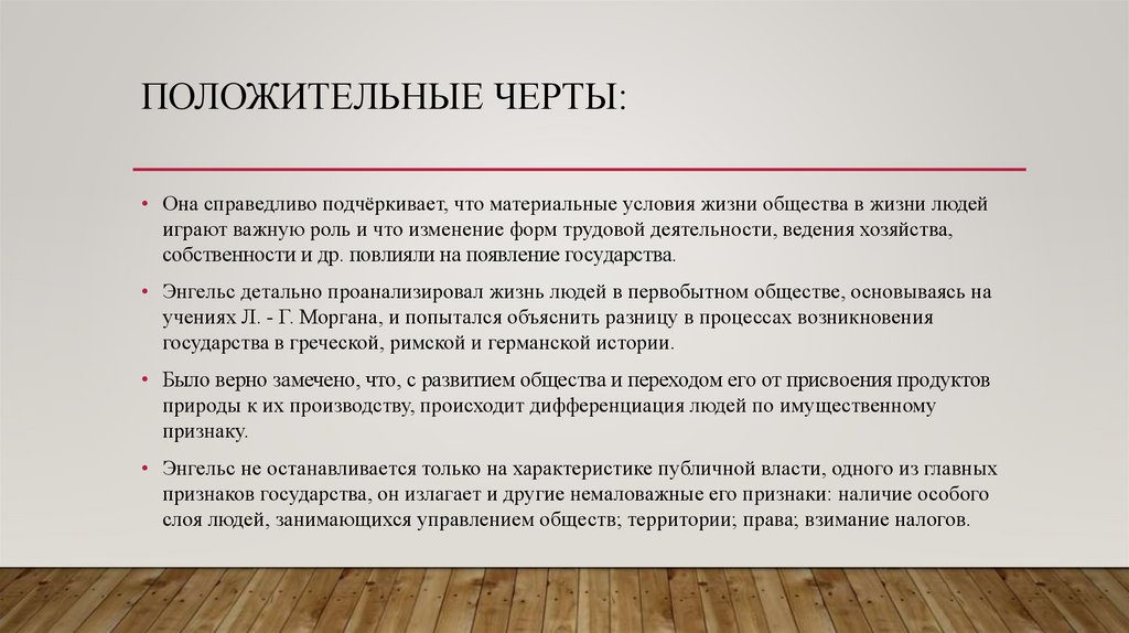 ПОЛОЖИТЕЛЬНЫЕ ЧЕРТЫ:• Она справедливо подчёркивает, что материальные условия жизни общества в жизни людей