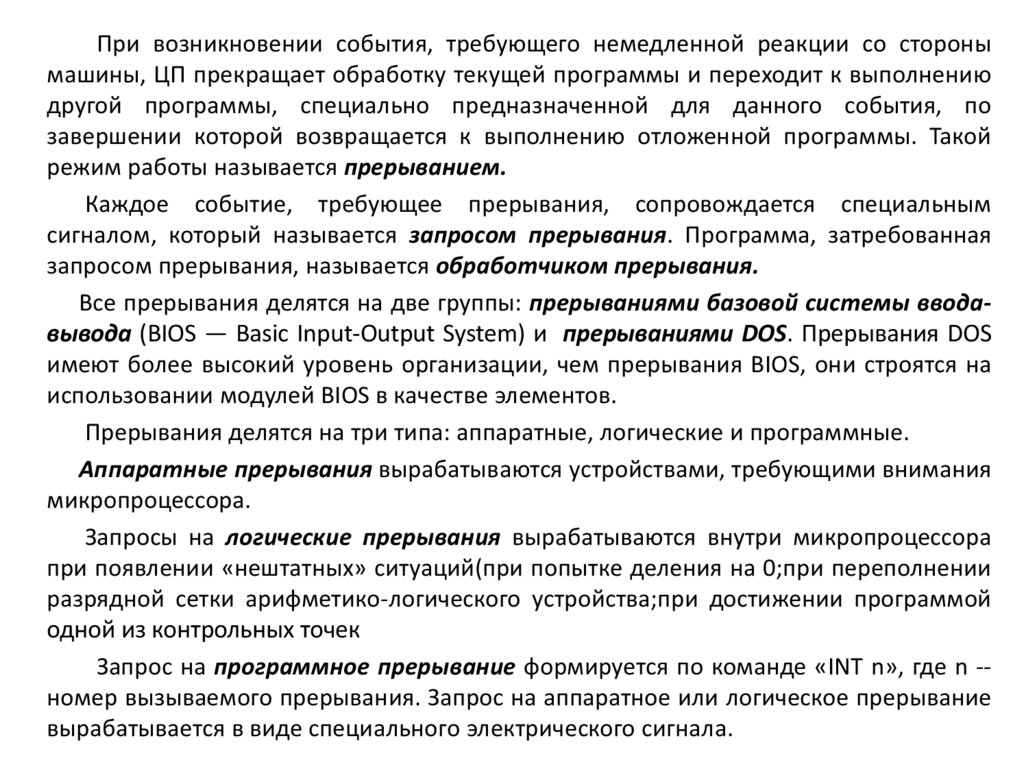 При возникновении события, требующего немедленной реакции со сторонымашины, ЦП прекращает обработку текущей программы и переходит к выполнению