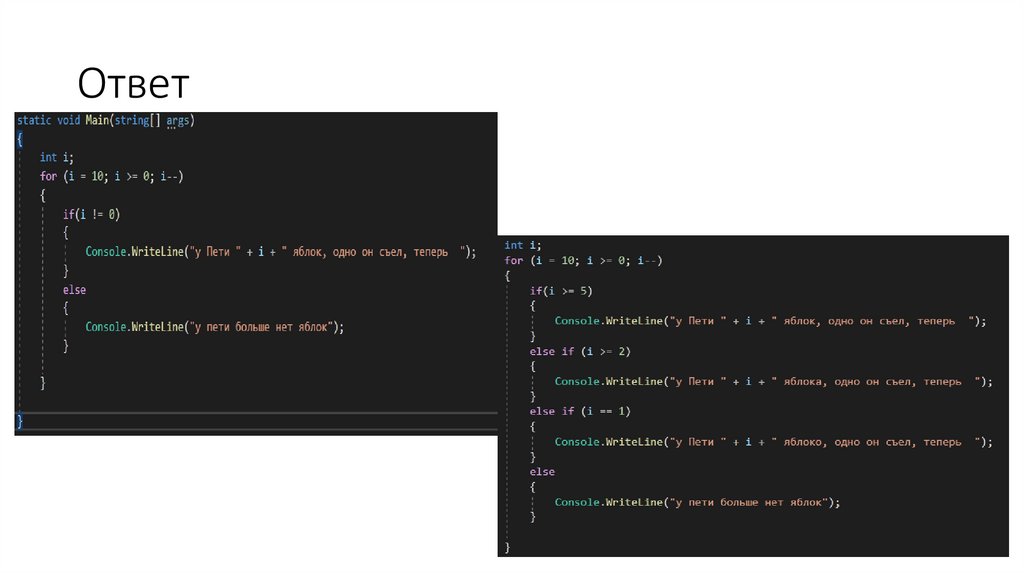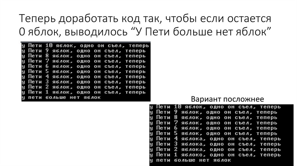 Теперь доработать код так, чтобы если остается0 яблок, выводилось “У Пети больше нет яблок”