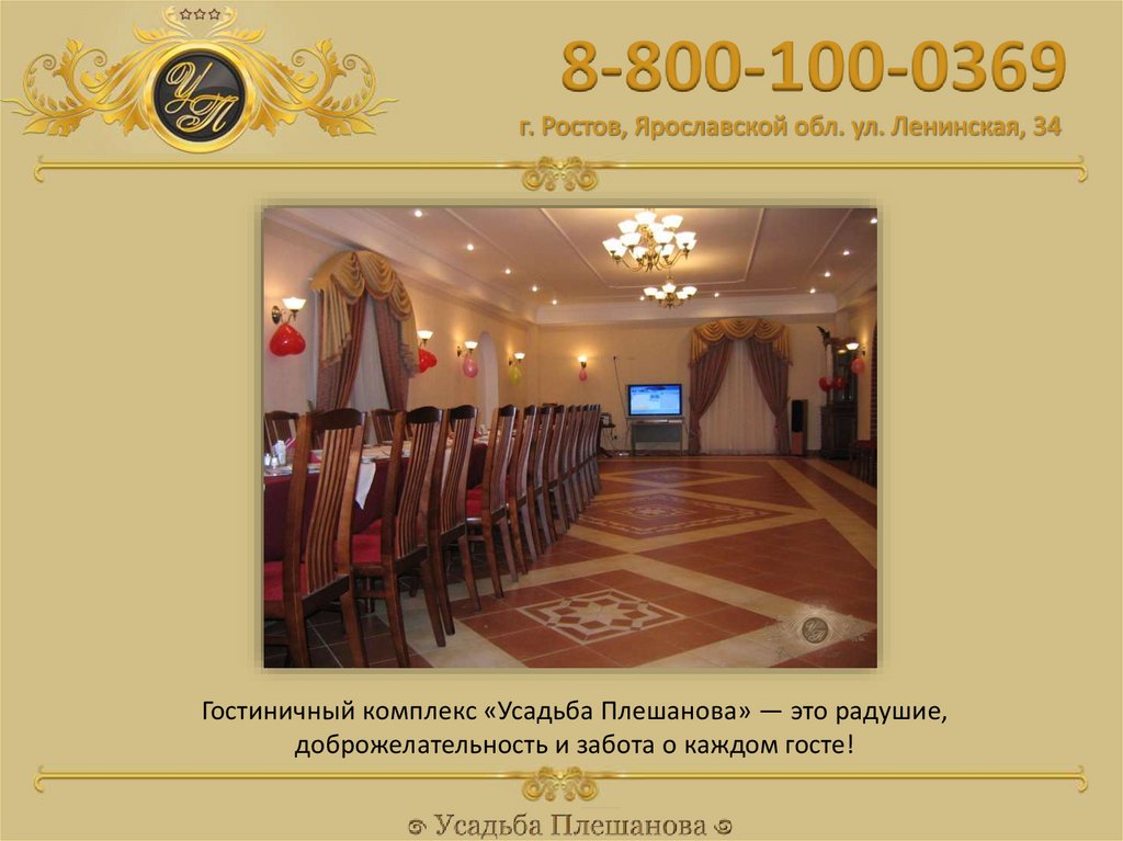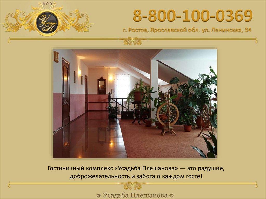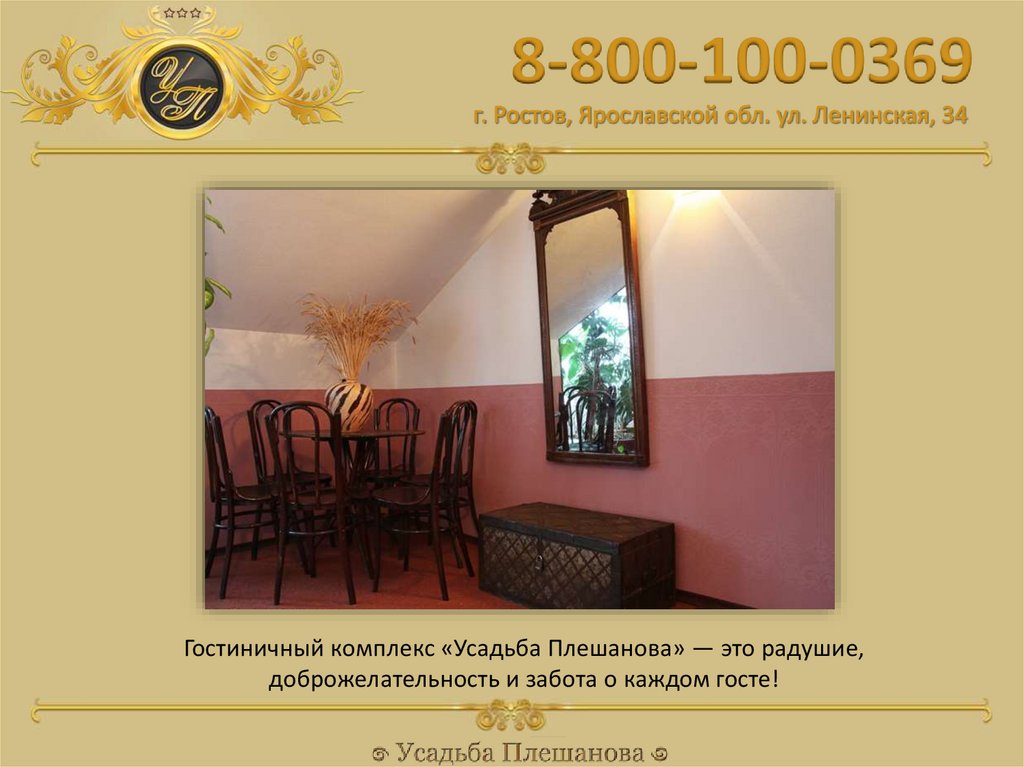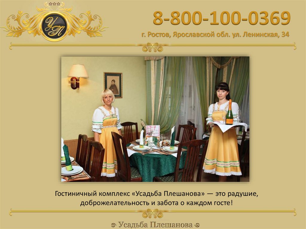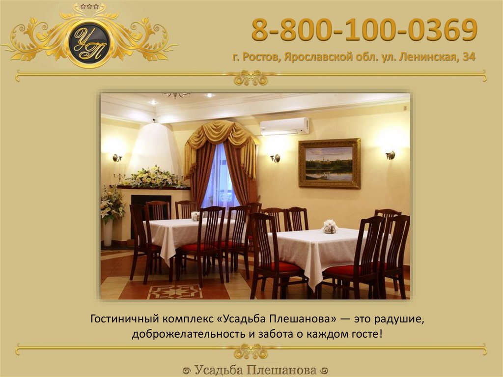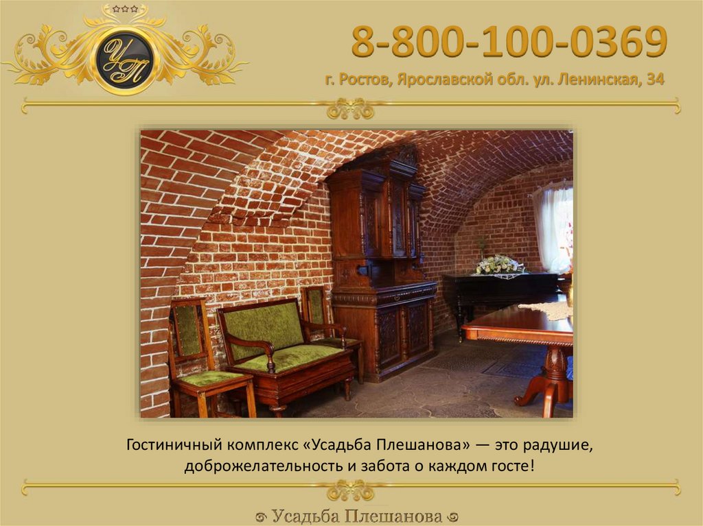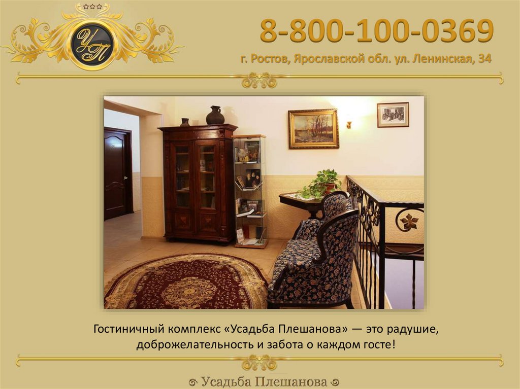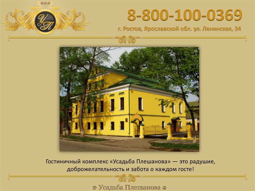 8-800-100-0369Гостиничный комплекс «Усадьба Плешанова» — это радушие,