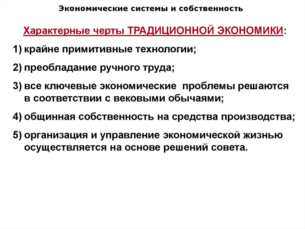Экономические системы и собственностьХарактерные черты ТРАДИЦИОННОЙ ЭКОНОМИКИ: