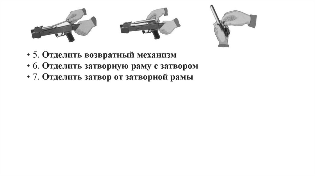 • 5. Отделить возвратный механизм• 6. Отделить затворную раму с затвором
