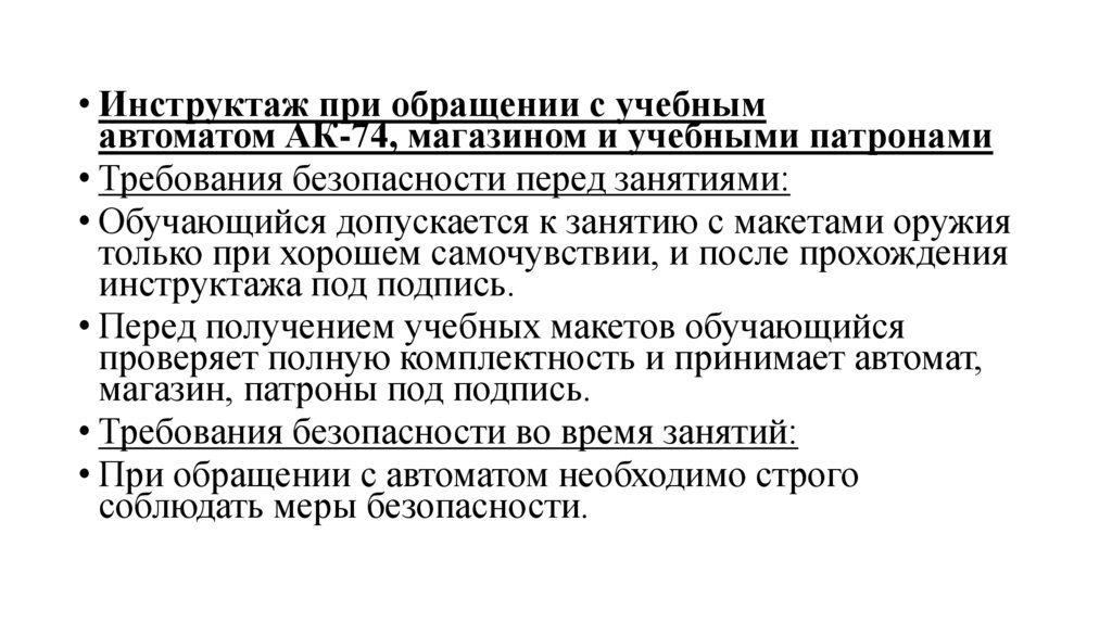 • Инструктаж при обращении с учебнымавтоматом АК-74, магазином и учебными патронами