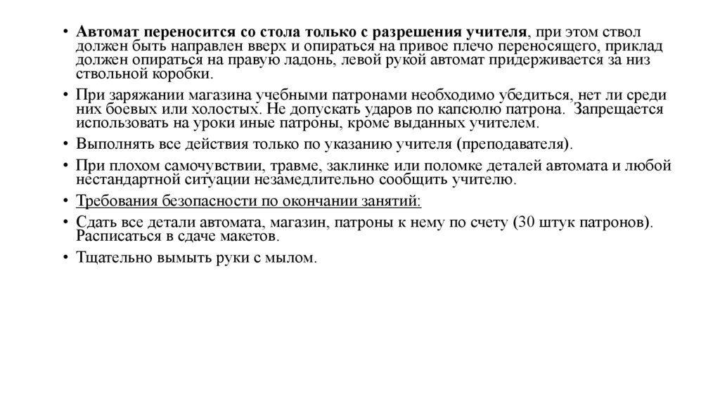 • Автомат переносится со стола только с разрешения учителя, при этом стволдолжен быть направлен вверх и опираться на привое плечо переносящего, приклад