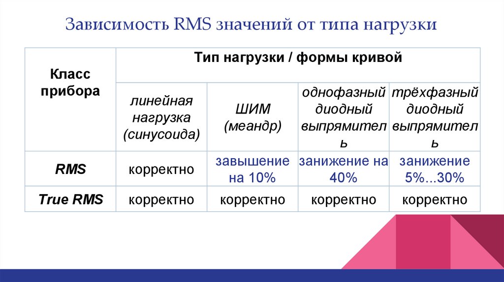 Зависимость RMS значений от типа нагрузкиТип нагрузки / формы кривой