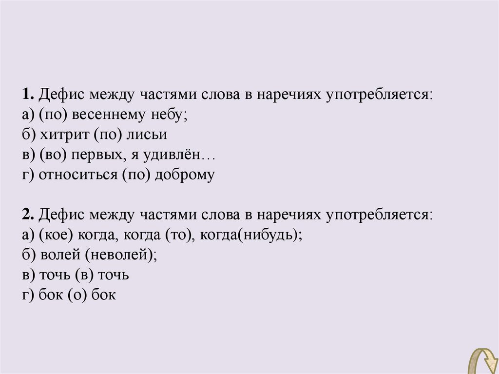 1. Дефис между частями слова в наречиях употребляется:а) (по) весеннему небу;