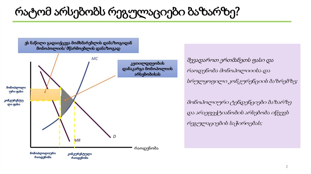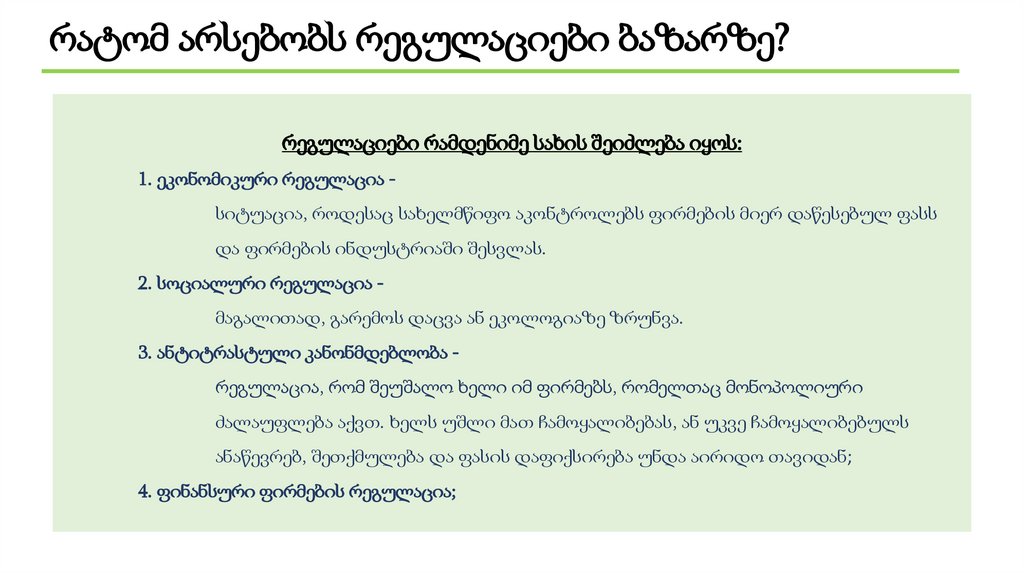 რატომ არსებობს რეგულაციები ბაზარზე?რეგულაციები რამდენიმე სახის შეიძლება იყოს: