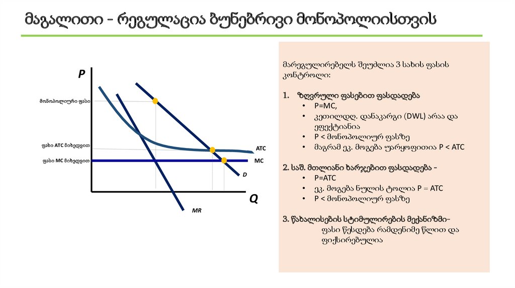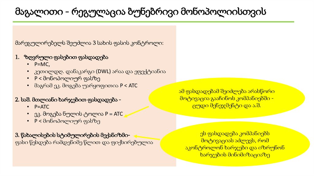 მაგალითი - რეგულაცია ბუნებრივი მონოპოლიისთვისმარეგულირებელს შეუძლია 3 სახის ფასის