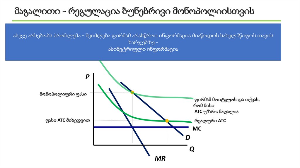 მაგალითი - რეგულაცია ბუნებრივი მონოპოლიისთვისასევე არსებობს პრობლემა - შეიძლება ფირმამ არასწროი ინფორმაცია მიაწოდოს სახელმწიფოს თავის