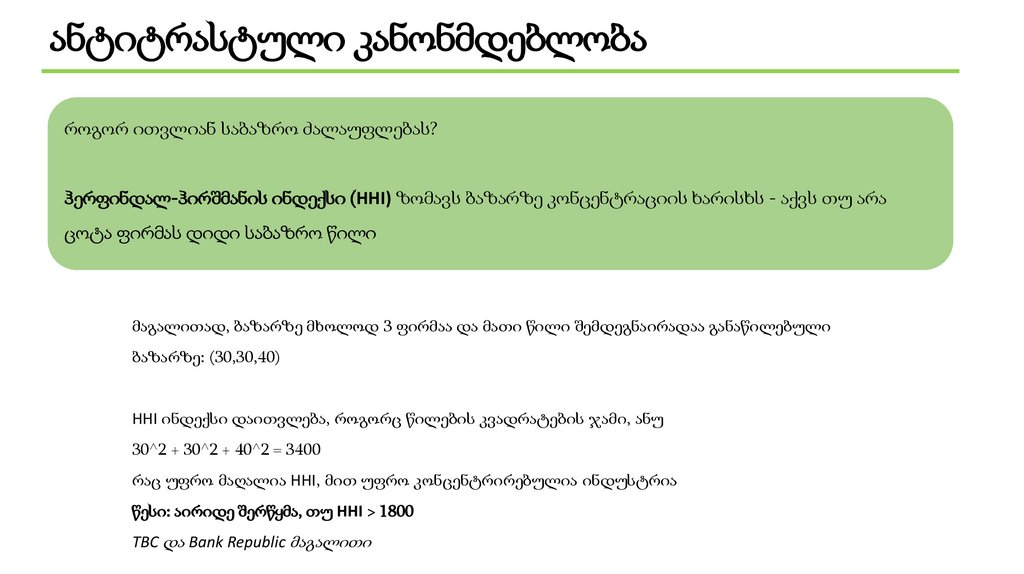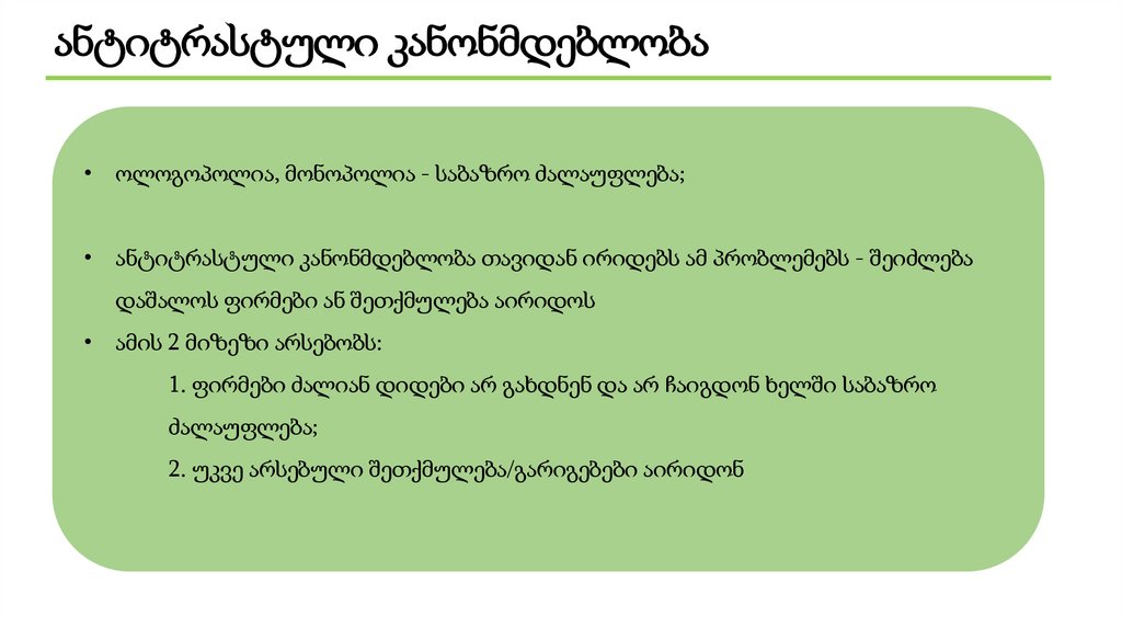 ანტიტრასტული კანონმდებლობა• ოლოგოპოლია, მონოპოლია - საბაზრო ძალაუფლება;