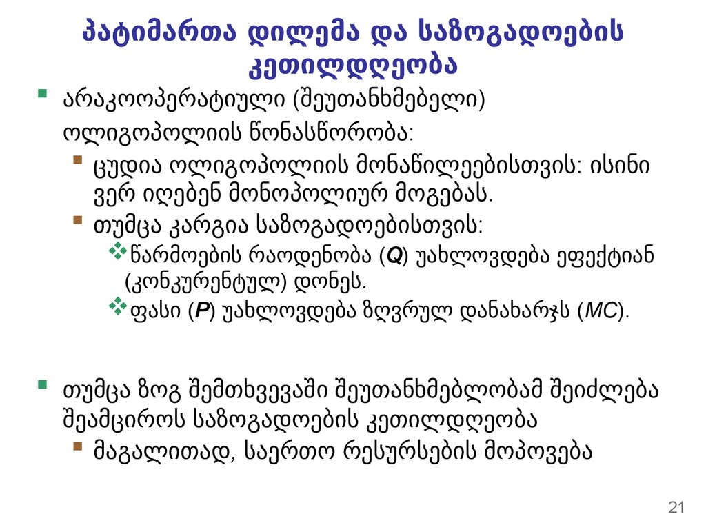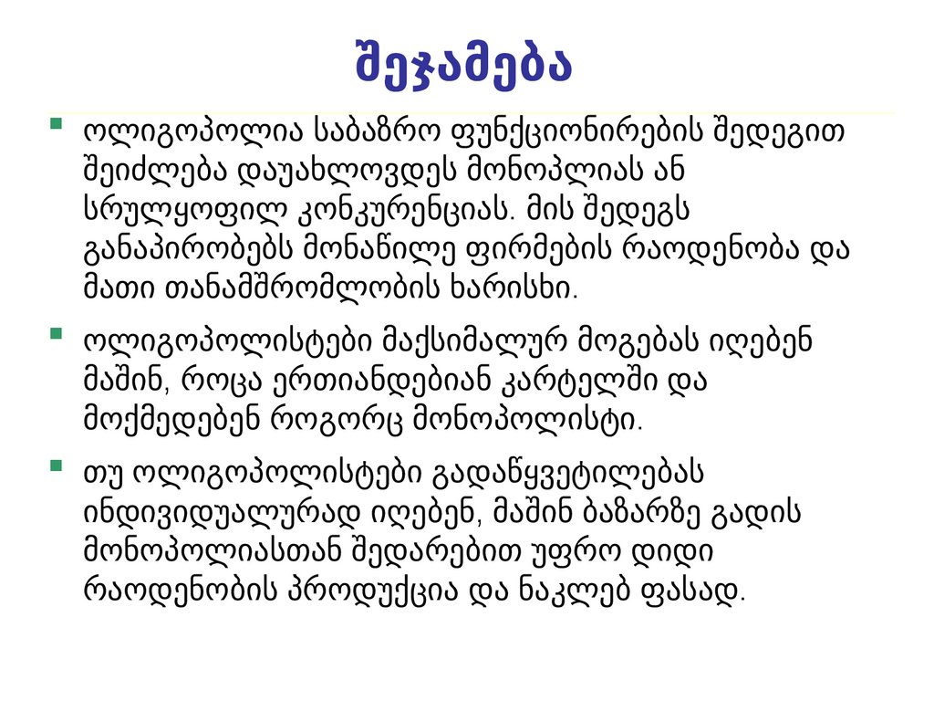 შეჯამებაოლიგოპოლია საბაზრო ფუნქციონირების შედეგით