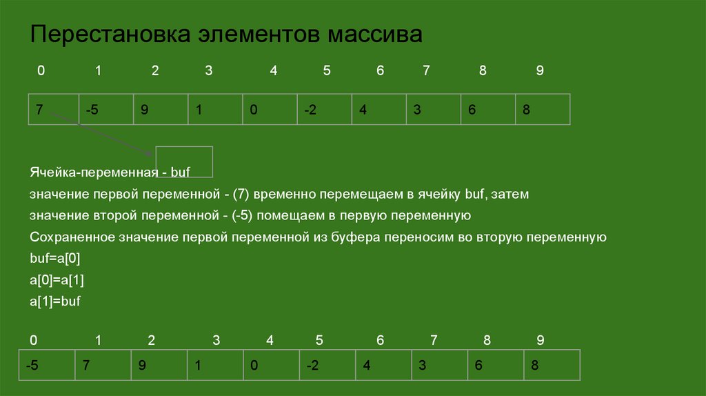 значение первой переменной - (7) временно перемещаем в ячейку buf, затем