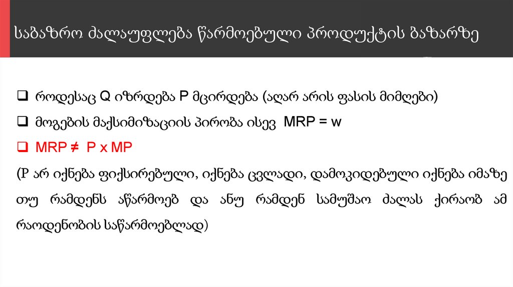 საბაზრო ძალაუფლება წარმოებული პროდუქტის ბაზარზეროდესაც Q იზრდება P მცირდება (აღარ არის ფასის მიმღები)
