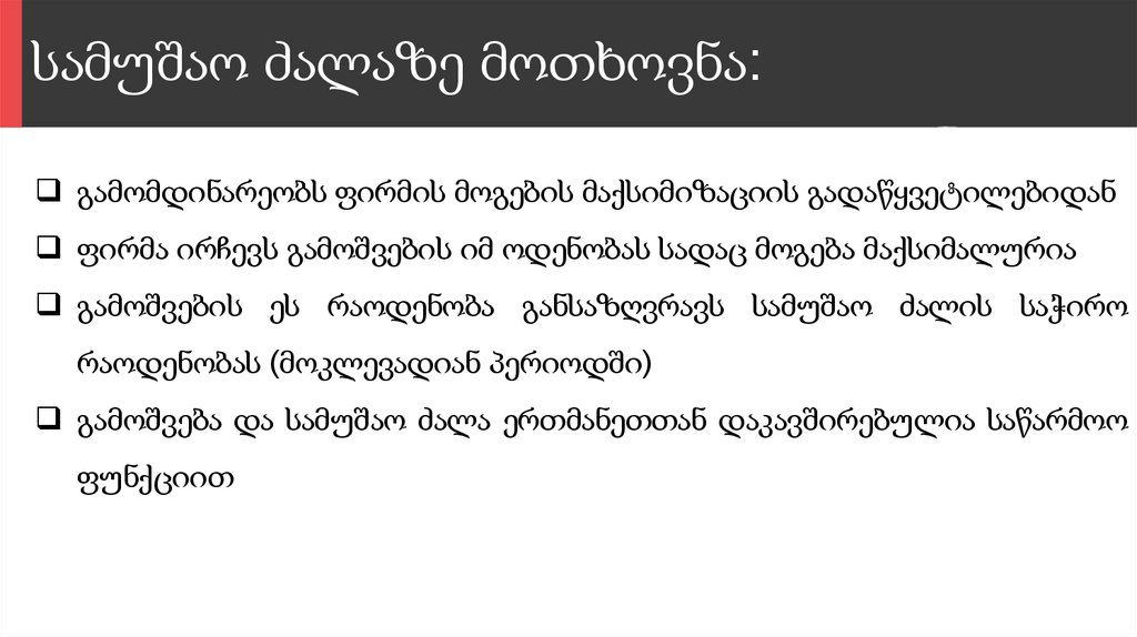 სამუშაო ძალაზე მოთხოვნა:გამომდინარეობს ფირმის მოგების მაქსიმიზაციის გადაწყვეტილებიდან