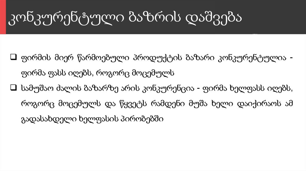 კონკურენტული ბაზრის დაშვებაფირმის მიერ წარმოებული პროდუქტის ბაზარი კონკურენტულია ფირმა ფასს იღებს, როგორც მოცემულს