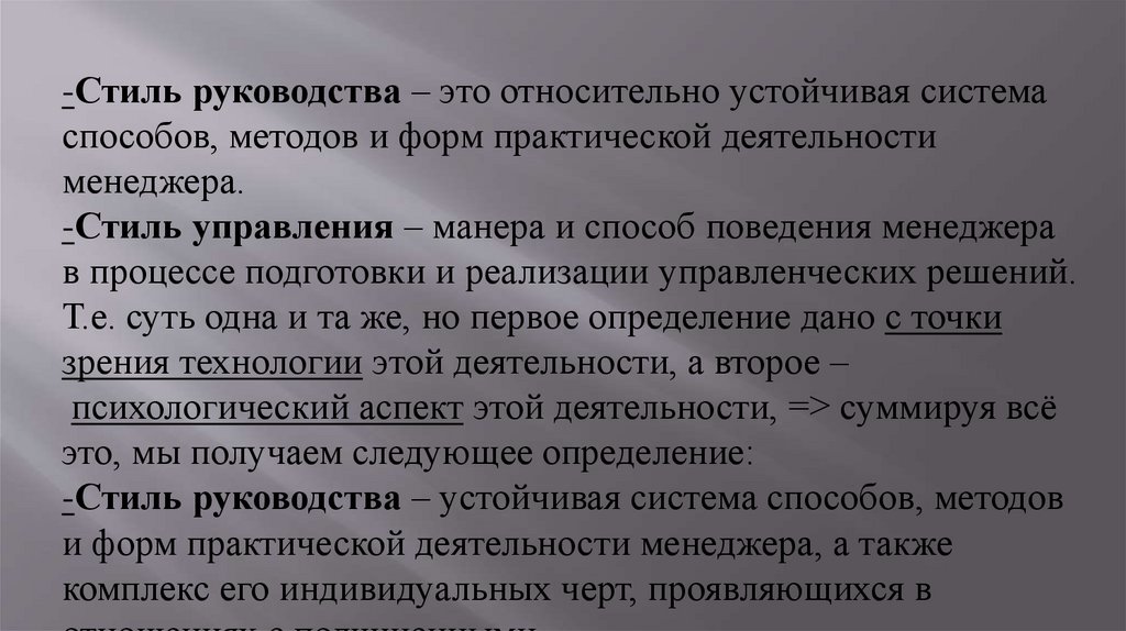 -Стиль руководства – это относительно устойчивая системаспособов, методов и форм практической деятельности
