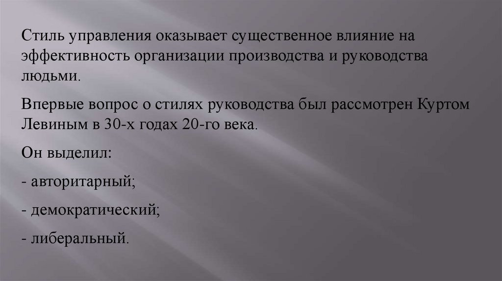 Впервые вопрос о стилях руководства был рассмотрен Куртом