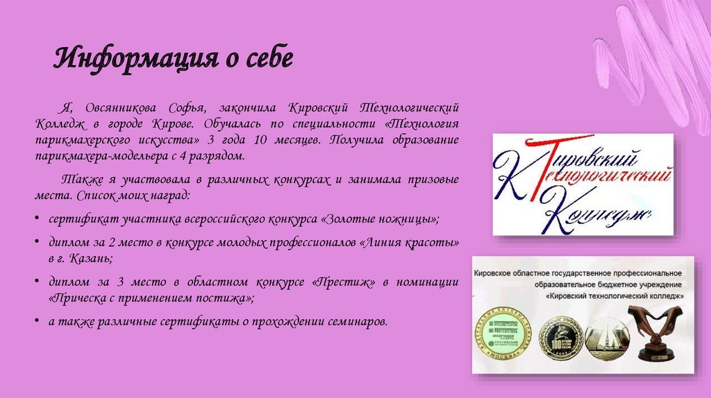 Информация о себеЯ, Овсянникова Софья, закончила Кировский Технологический