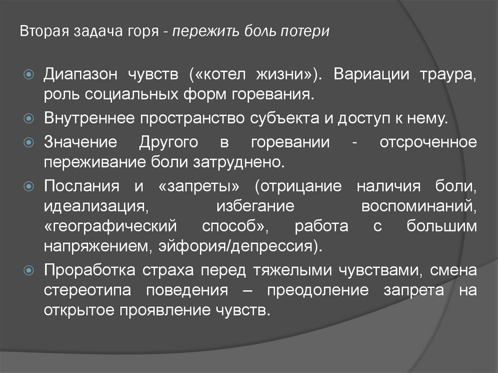 Вторая задача горя - пережить боль потериДиапазон чувств («котел жизни»). Вариации траура,