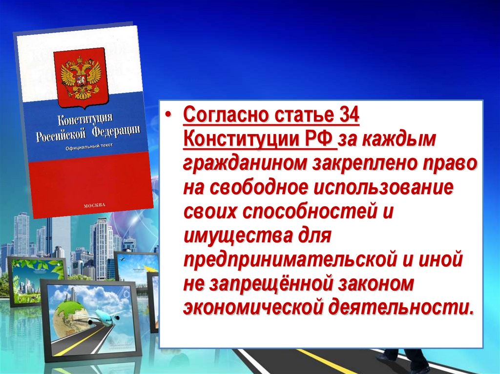 • Согласно статье 34Конституции РФ за каждым