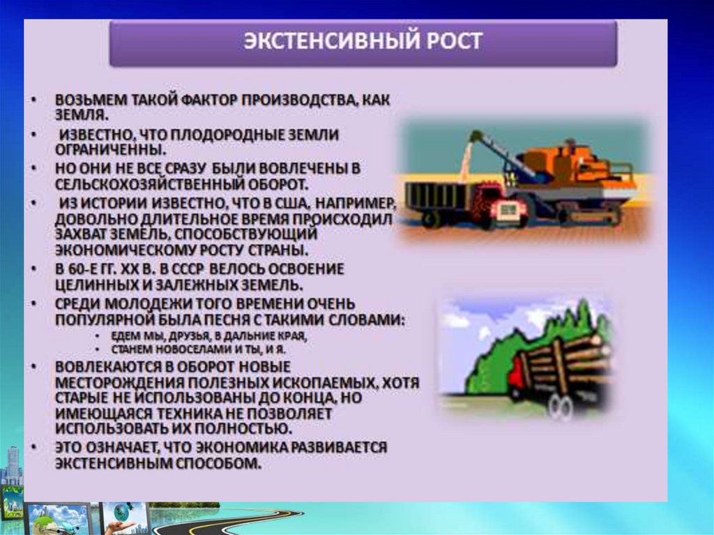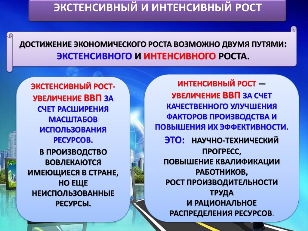ЭКСТЕНСИВНЫЙ И ИНТЕНСИВНЫЙ РОСТДОСТИЖЕНИЕ ЭКОНОМИЧЕСКОГО РОСТА ВОЗМОЖНО ДВУМЯ ПУТЯМИ:
