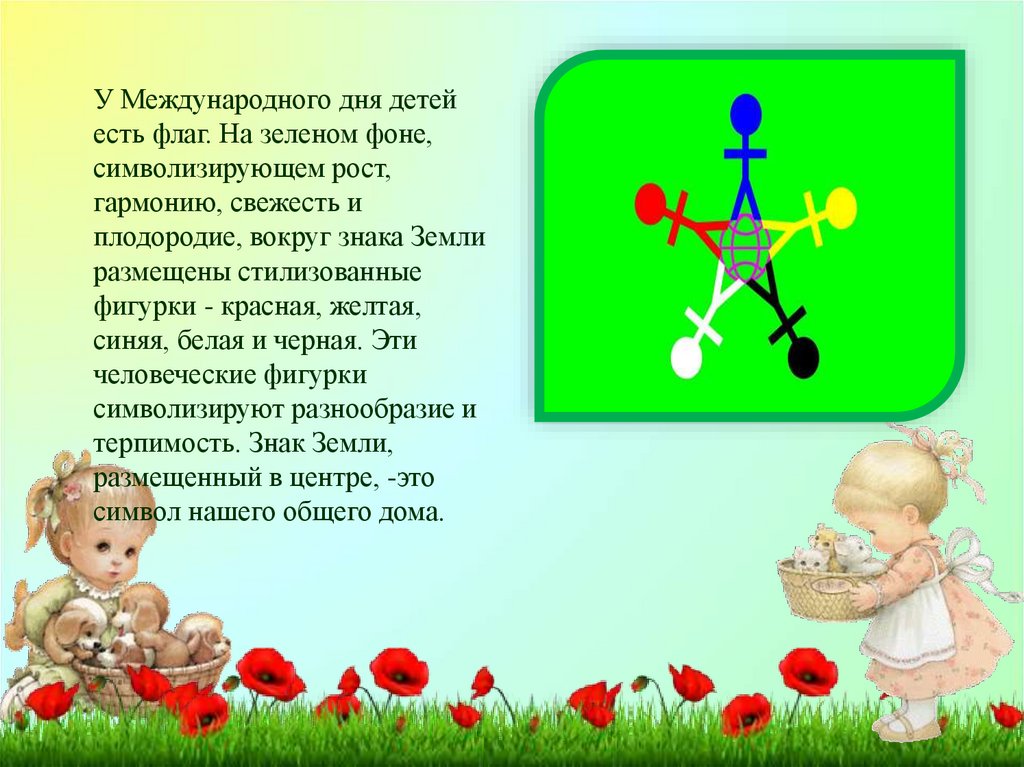У Международного дня детейесть флаг. На зеленом фоне,