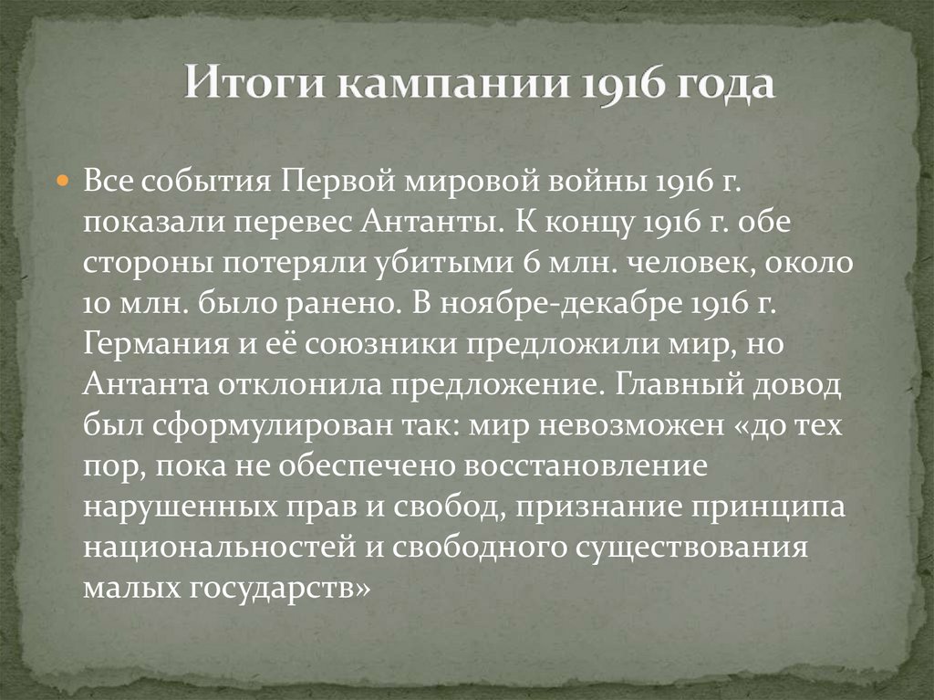 Все события Первой мировой войны 1916 г.показали перевес Антанты. К концу 1916 г. обе