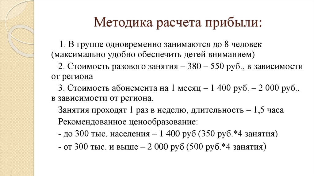 Методика расчета прибыли:1. В группе одновременно занимаются до 8 человек