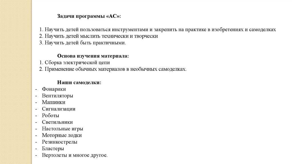 Задачи программы «АС»:1. Научить детей пользоваться инструментами и закрепить на практике в изобретениях и самоделках