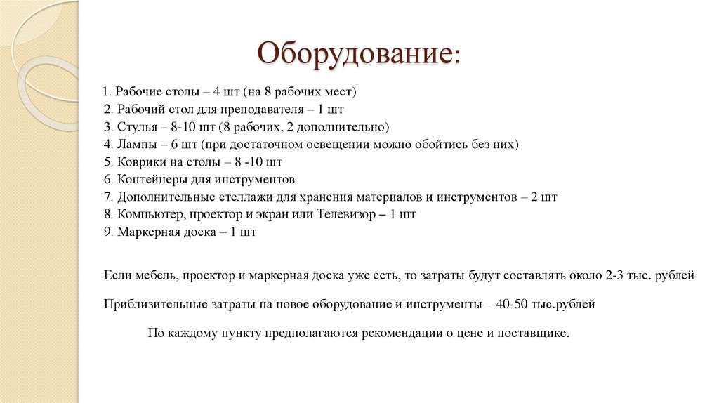 Приблизительные затраты на новое оборудование и инструменты – 40-50 тыс.рублей