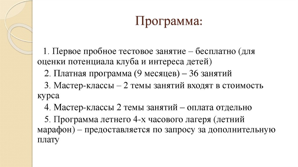 Программа:1. Первое пробное тестовое занятие – бесплатно (для