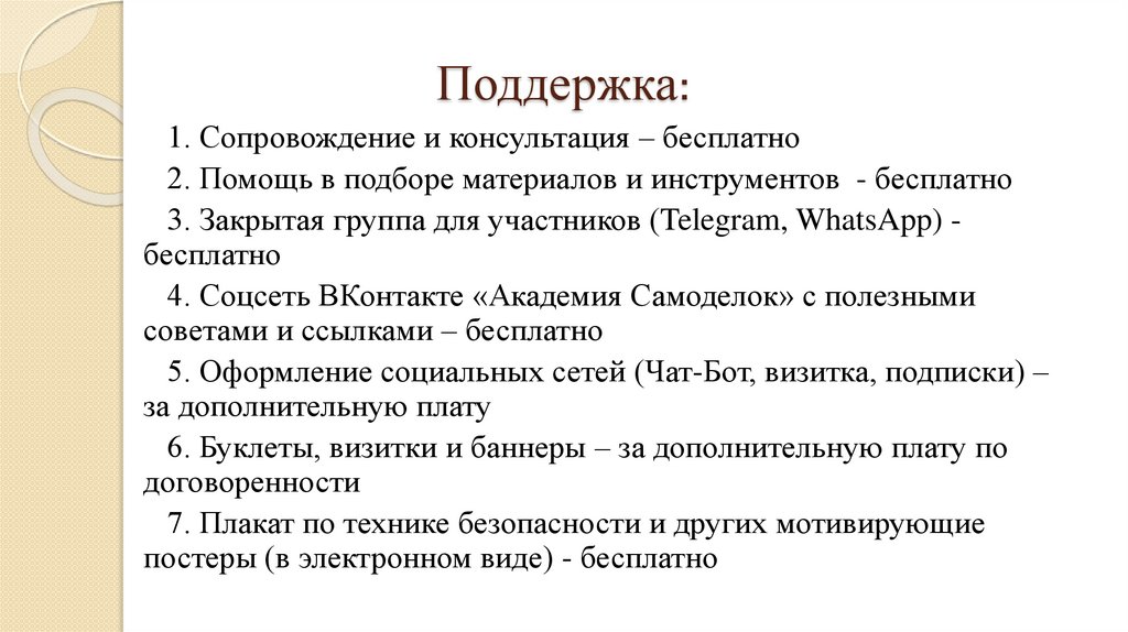 Поддержка:1. Сопровождение и консультация – бесплатно