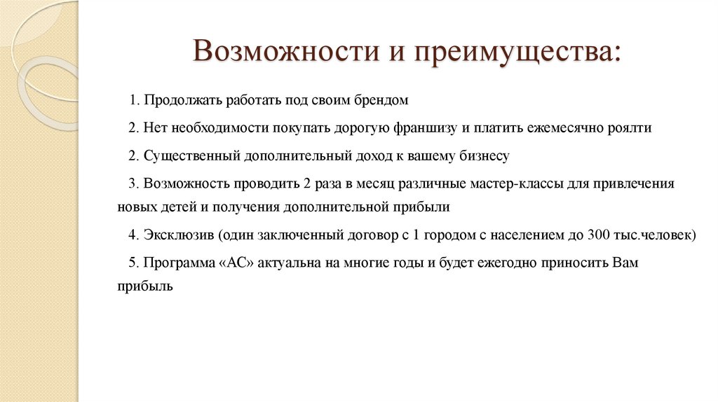 Возможности и преимущества:1. Продолжать работать под своим брендом