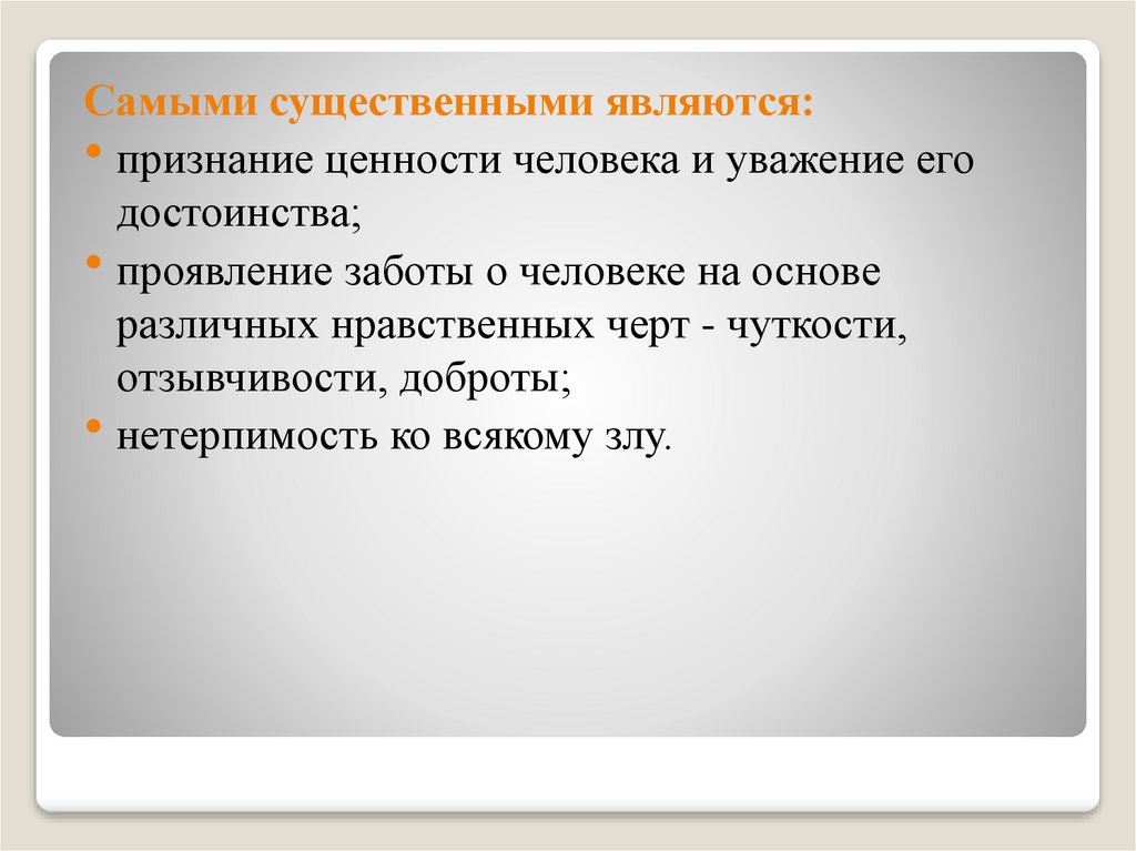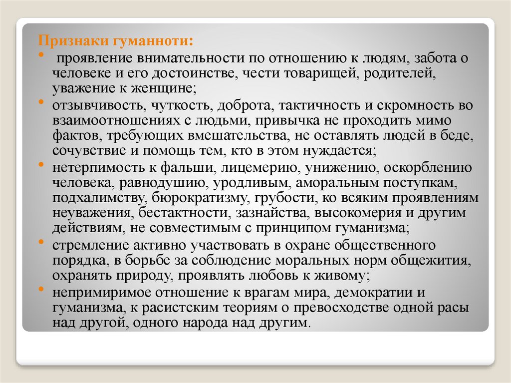 Признаки гуманноти:проявление внимательности по отношению к людям, забота о