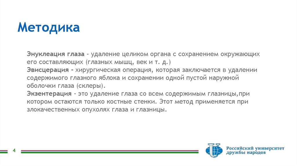 МетодикаЭнуклеация глаза - удаление целиком органа с сохранением окружающих