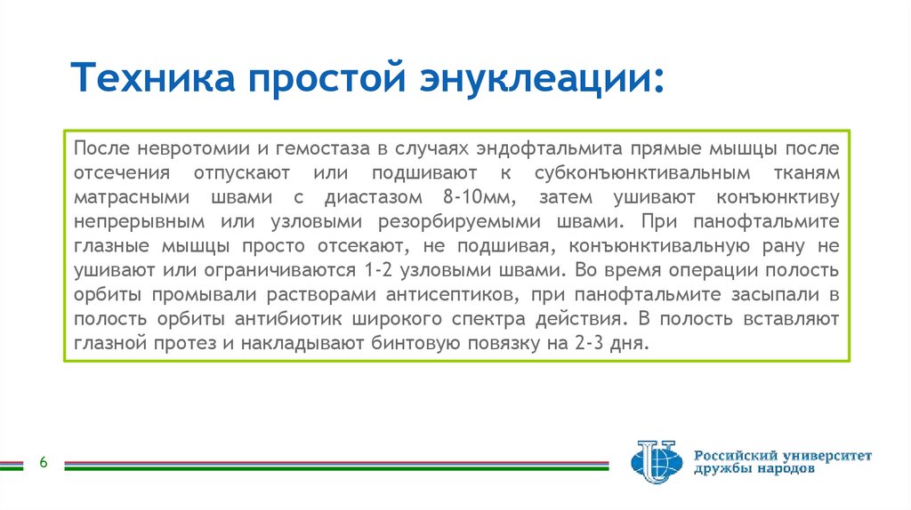 Техника простой энуклеации:После невротомии и гемостаза в случаях эндофтальмита прямые мышцы после