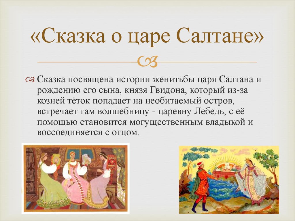 «Сказка о царе Салтане»Сказка посвящена истории женитьбы царя Салтана и