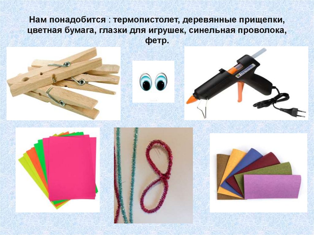 Нам понадобится : термопистолет, деревянные прищепки,цветная бумага, глазки для игрушек, синельная проволока,