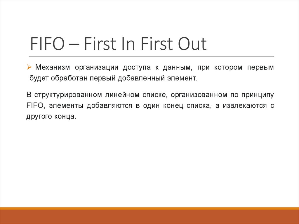 FIFO – First In First OutМеханизм организации доступа к данным, при котором первым