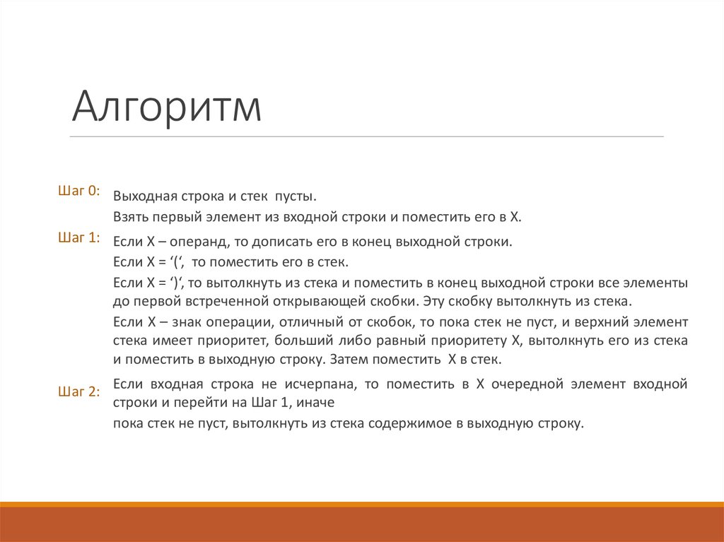 АлгоритмШаг 0: Выходная строка и стек пусты.