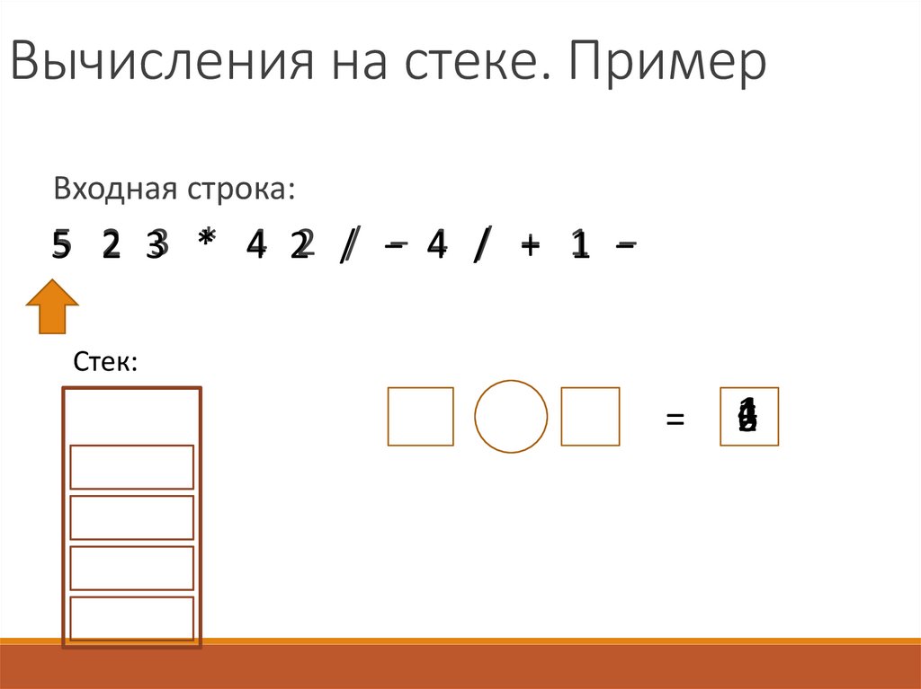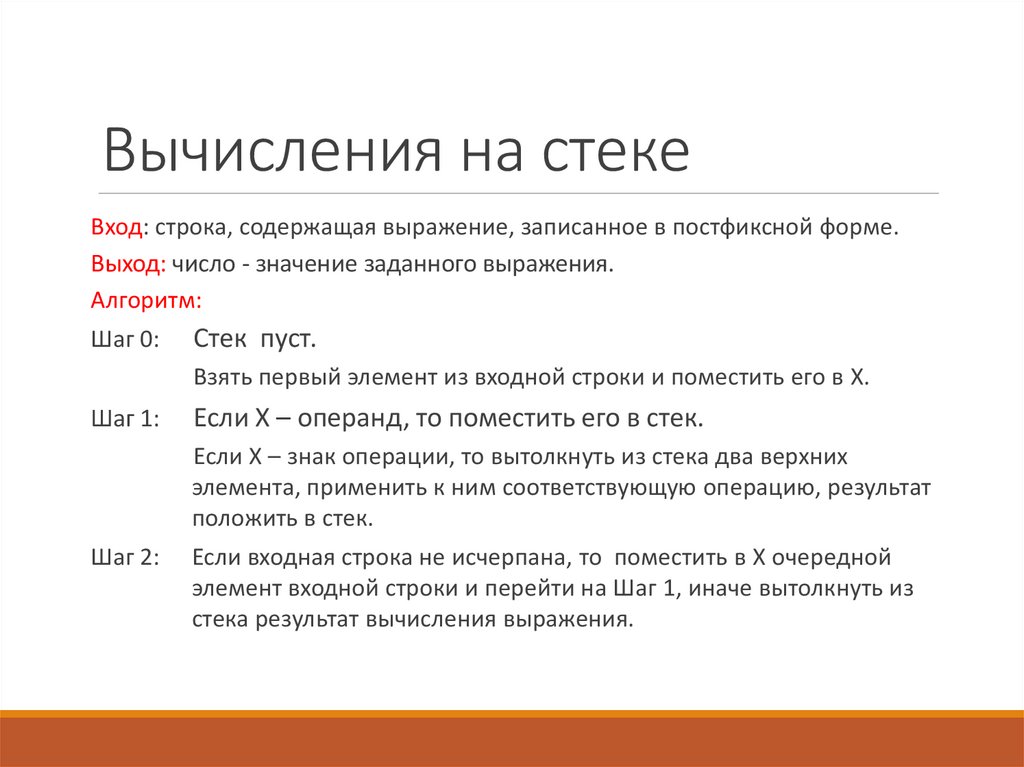 Вычисления на стекеВход: строка, содержащая выражение, записанное в постфиксной форме.
