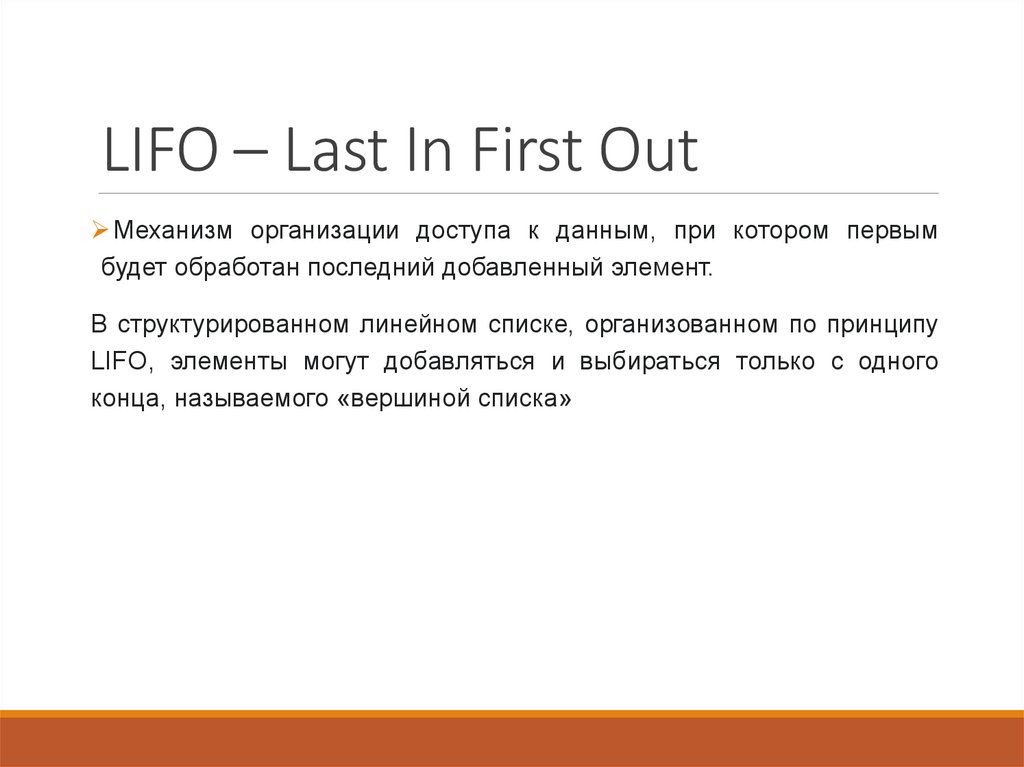 LIFO – Last In First OutМеханизм организации доступа к данным, при котором первым