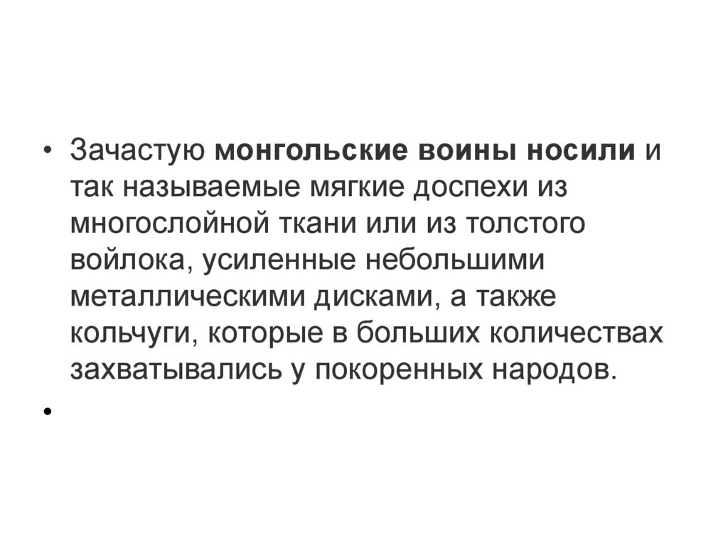 • Зачастую монгольские воины носили итак называемые мягкие доспехи из