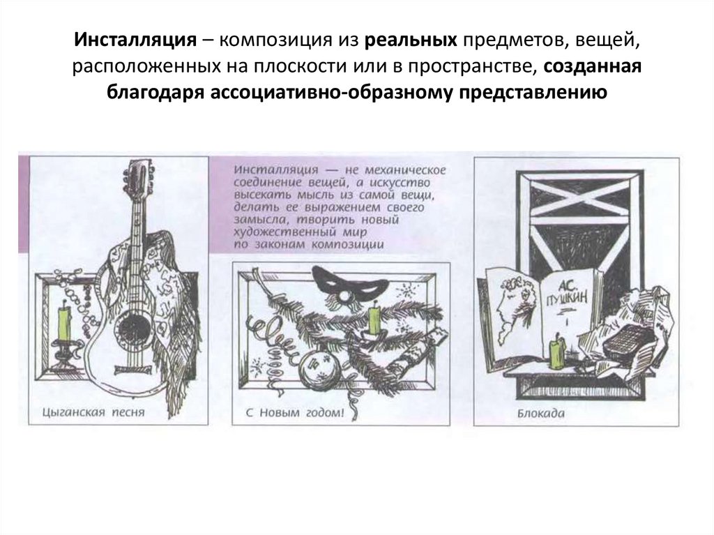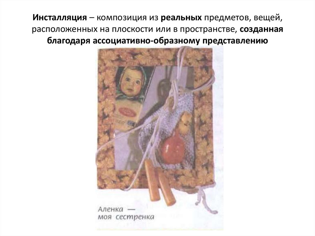 Инсталляция – композиция из реальных предметов, вещей,расположенных на плоскости или в пространстве, созданная