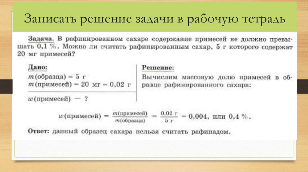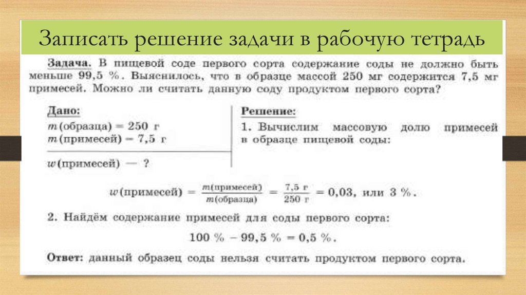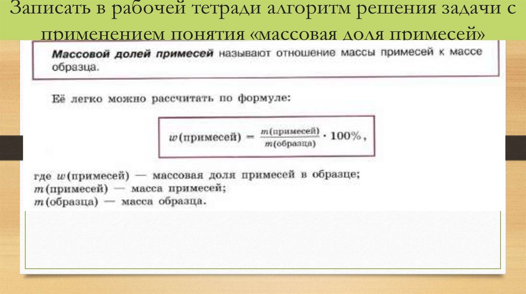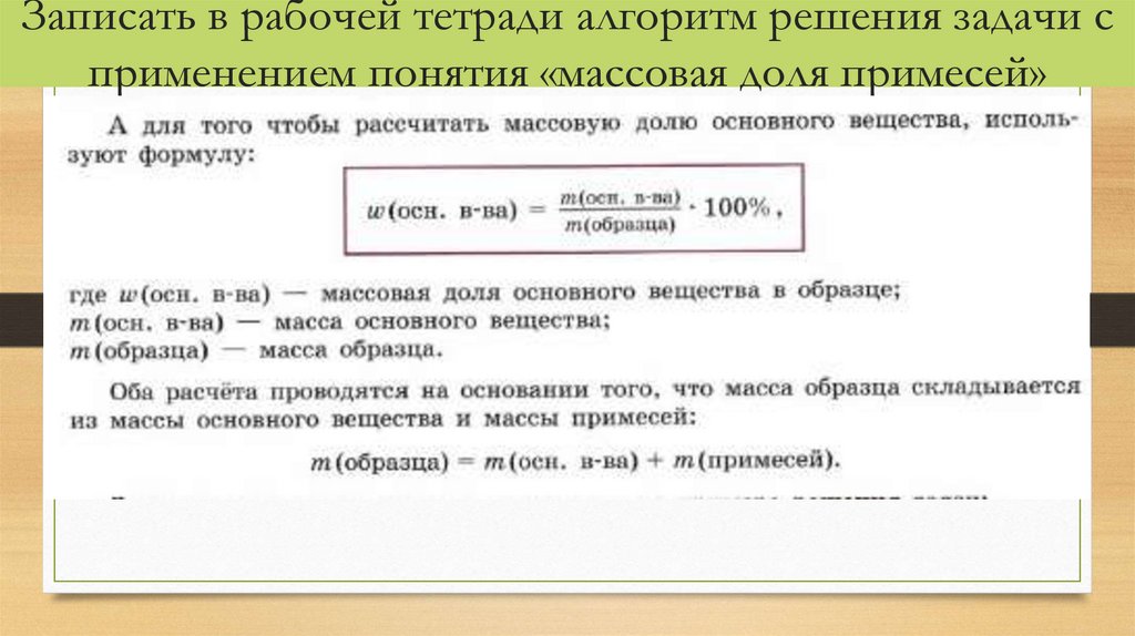 Записать в рабочей тетради алгоритм решения задачи сприменением понятия «массовая доля примесей»