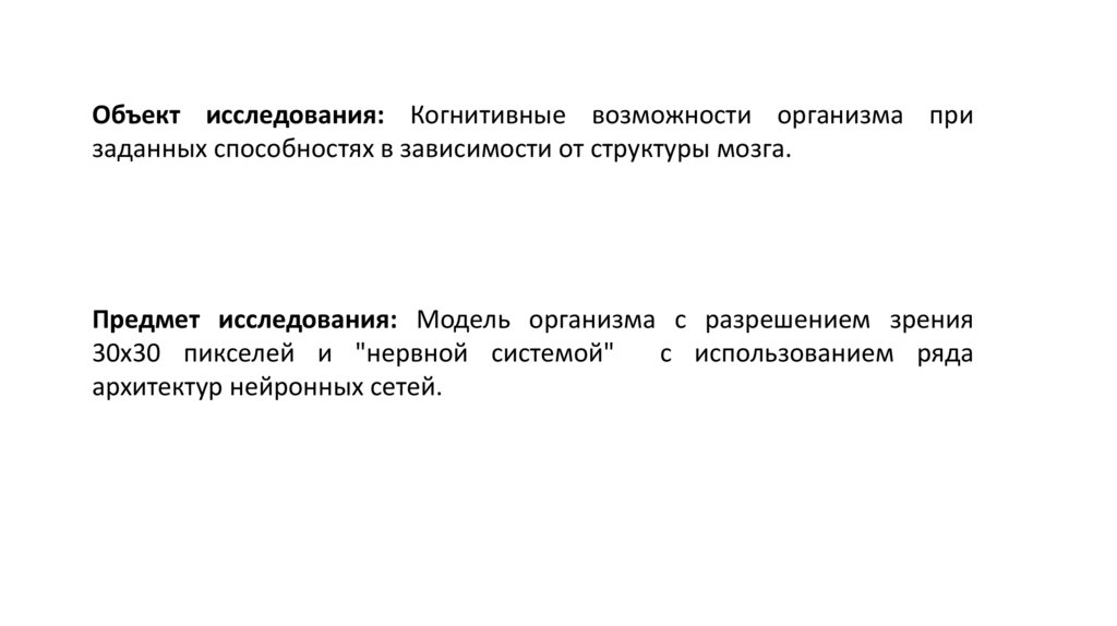 Объект исследования: Когнитивные возможности организма призаданных способностях в зависимости от структуры мозга.