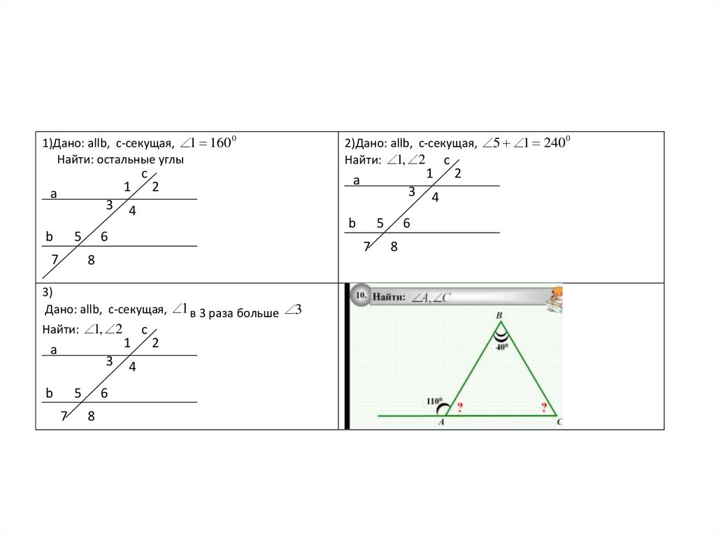 1)Дано: аllb, с-секущая, 1 160 0Найти: остальные углы